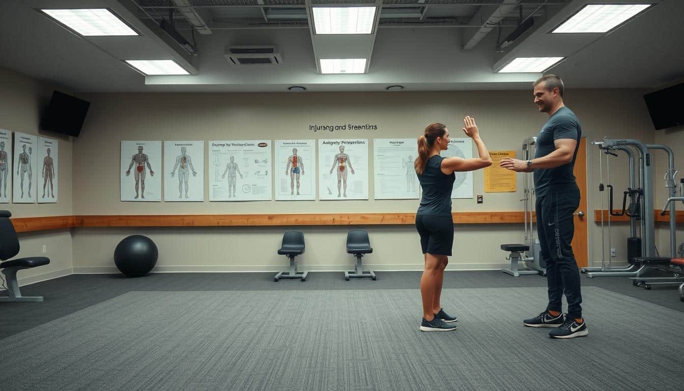 A-well-lit-indoor-sports-medicine-clinic.-In-the-foreground-an-athletic-trainer-demonstrates