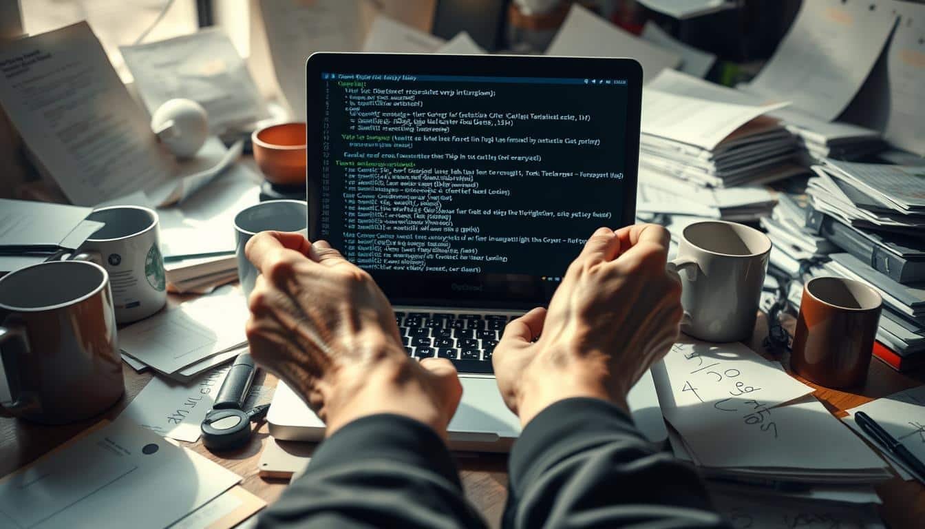 A-cluttered-desk-with-scattered-papers-coffee-mugs-and-a-laptop-displaying-a-jumble-of-error-