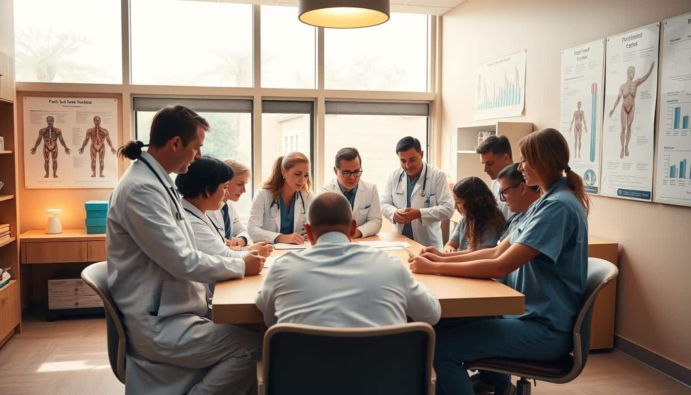 A-bustling-medical-office-the-care-team-gathered-around-a-central-conference-table.-Doctors