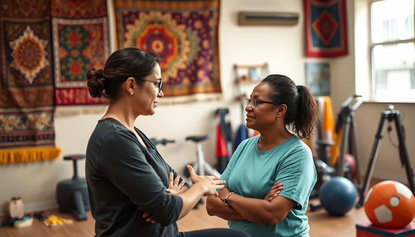 An-intercultural-sports-therapy-clinic-its-walls-adorned-with-vibrant-cultural-tapestries.-In-