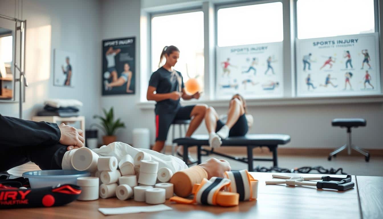 A well-lit sports therapy clinic, with a mid-ground of a physical therapist demonstrating injury management steps to a patient. In the foreground, an array of medical equipment and supplies, such as bandages, ice packs, and compression devices. The background features a clean, modern aesthetic with wall displays showcasing sports injury recovery timelines and rehabilitation exercises. Subtle natural lighting from large windows casts a warm, calming ambiance over the scene. The overall composition conveys a sense of professionalism, expertise, and a patient-centered approach to effective sports injury management.