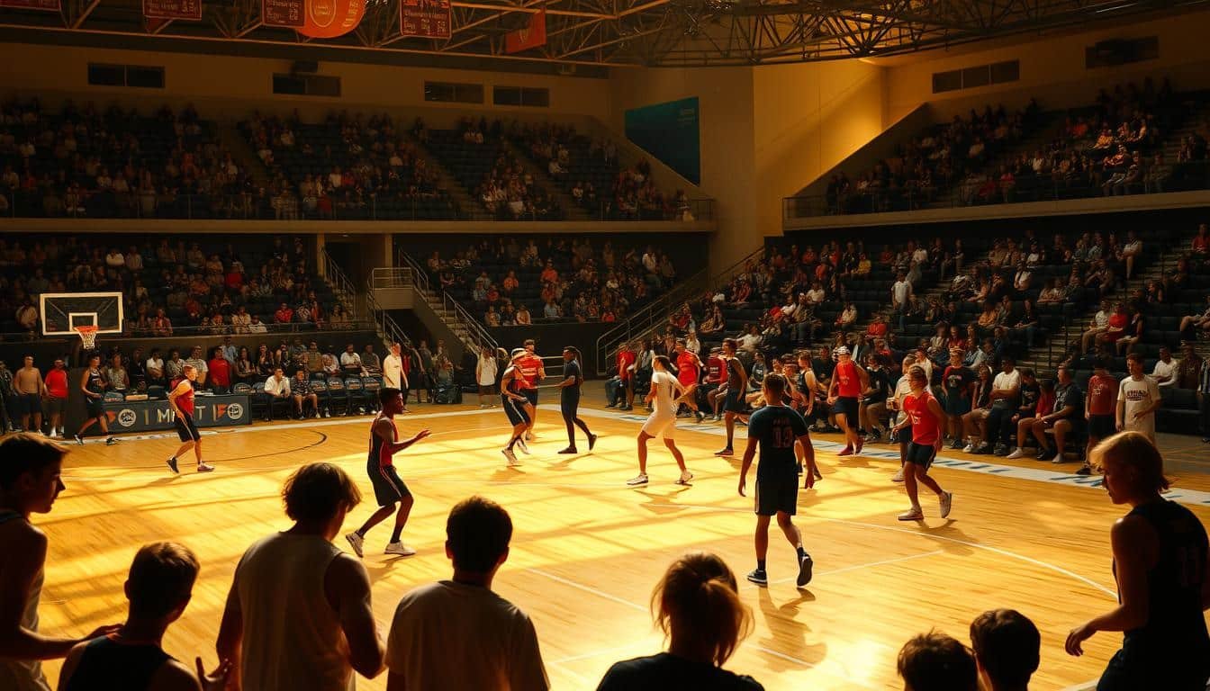 A bustling sports arena, with athletes of varying skill levels engaged in various athletic pursuits. In the foreground, a group of amateur players enthusiastically practicing their techniques on the court, their expressions focused and determined. In the middle ground, seasoned professionals showcase their mastery, moving with fluid grace and precision. The background is filled with spectators, their silhouettes creating a sense of energy and anticipation. The lighting is warm and natural, casting a golden glow over the scene and highlighting the athletes' dedication and passion. The composition is dynamic, with diagonal lines and overlapping figures creating a sense of movement and vitality. The overall atmosphere conveys the inclusive and uplifting nature of sports therapy, catering to individuals at all levels of athletic ability.