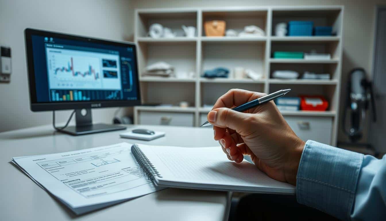 A well-lit, clinical examination room with a medical chart on a desk and a computer monitor displaying graphs and charts. In the foreground, a person's hand holds a pen, poised over a notepad, ready to make adjustments to a training regimen. The background features shelves with medical equipment and supplies, conveying a sense of professionalism and attention to detail. Soft, directional lighting illuminates the scene, creating a serene and focused atmosphere conducive to thoughtful decision-making regarding an individual's rehabilitation program.