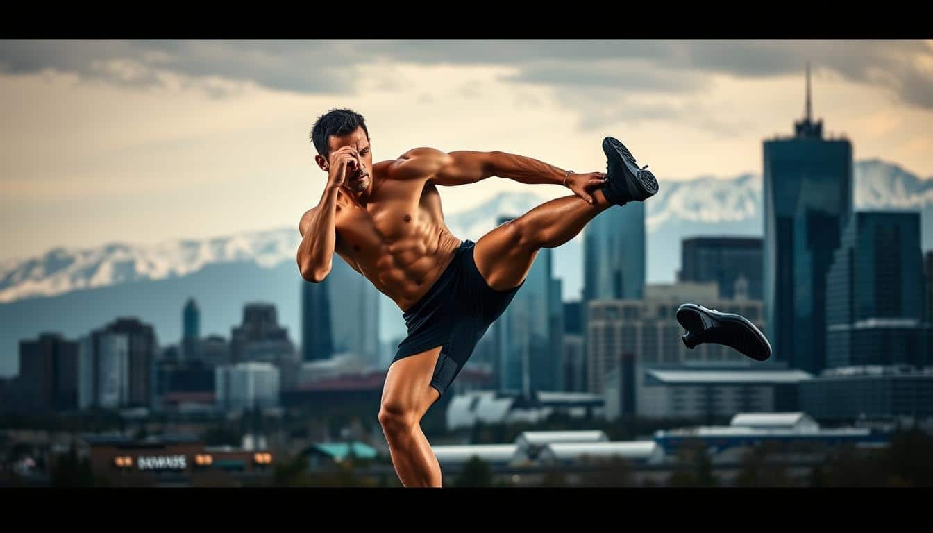 A high-performance athlete in motion, executing a dynamic exercise routine against the backdrop of the iconic Calgary skyline. Crisp, detailed lighting illuminates their muscular physique as they powerfully engage core and limb muscles. The cityscape provides an urban, industrial atmosphere, with a hint of the Rocky Mountains in the distance. The scene conveys an atmosphere of focus, determination, and the pursuit of athletic excellence - the essence of the Calgary athlete case studies.
