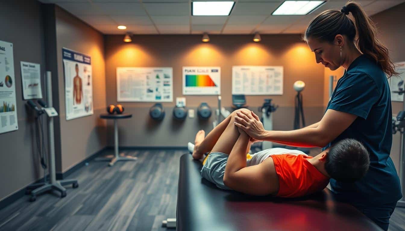 A-sports-medicine-clinic-bathed-in-warm-diffused-lighting.-In-the-foreground-an-athlete-lies