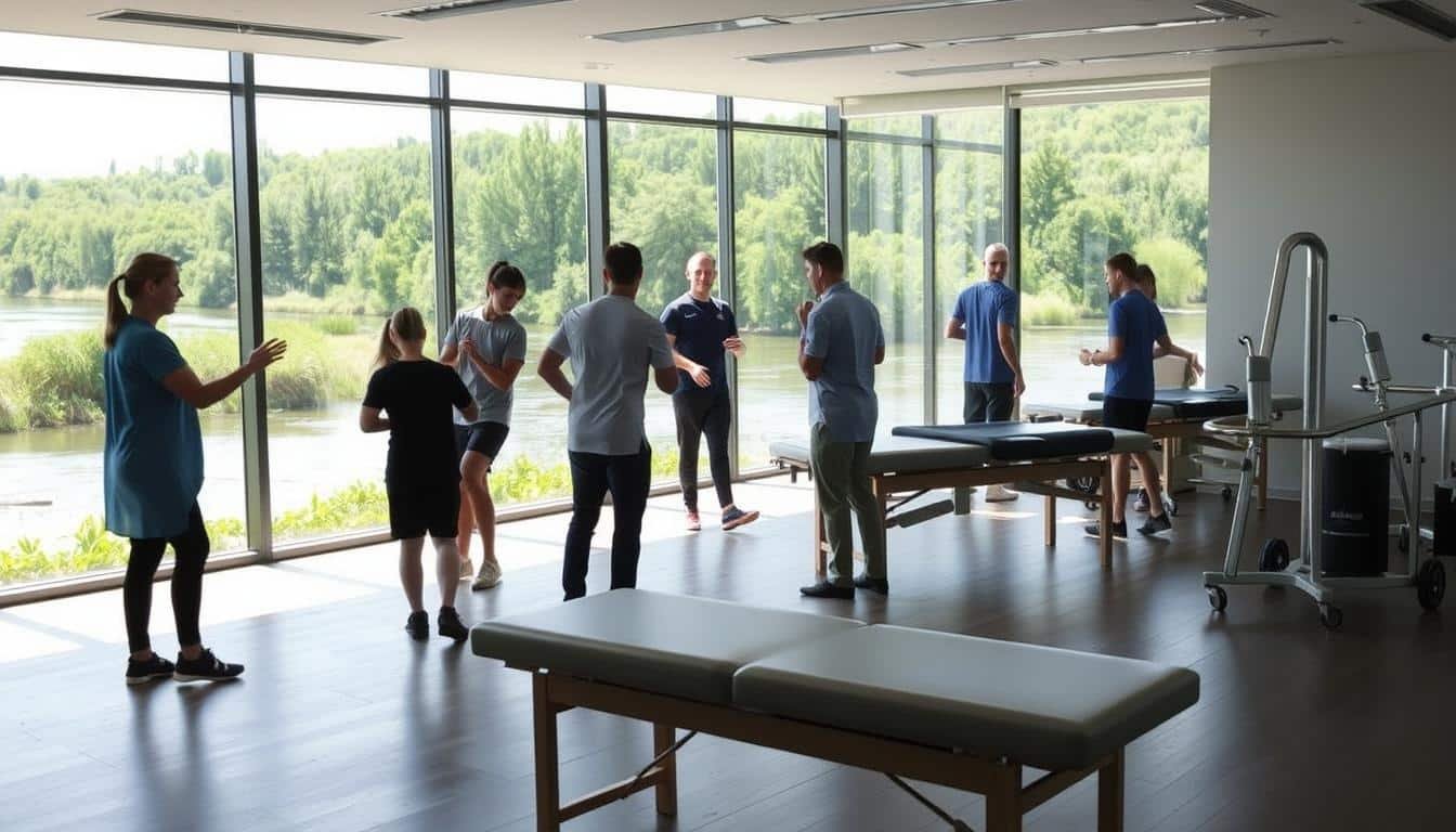 A modern sports therapy clinic set against a serene riverside landscape. In the foreground, a team of physiotherapists and trainers guide patients through personalized rehabilitation exercises, their movements captured in a soft, natural lighting. The middle ground showcases specialized equipment and treatment tables, while the background reveals the calming flow of the river and lush greenery beyond, conveying a sense of tranquility and holistic healing. The overall atmosphere is one of professionalism, care, and a focus on patient-centric recovery, reflecting the Riverside Sports Therapy approach to rehabilitation.