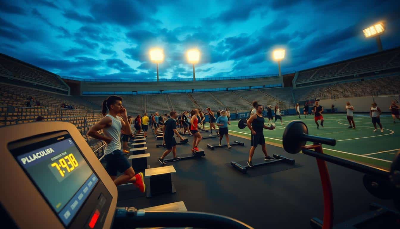A-sports-stadium-at-twilight-filled-with-athletes-engaged-in-various-training-exercises.-In