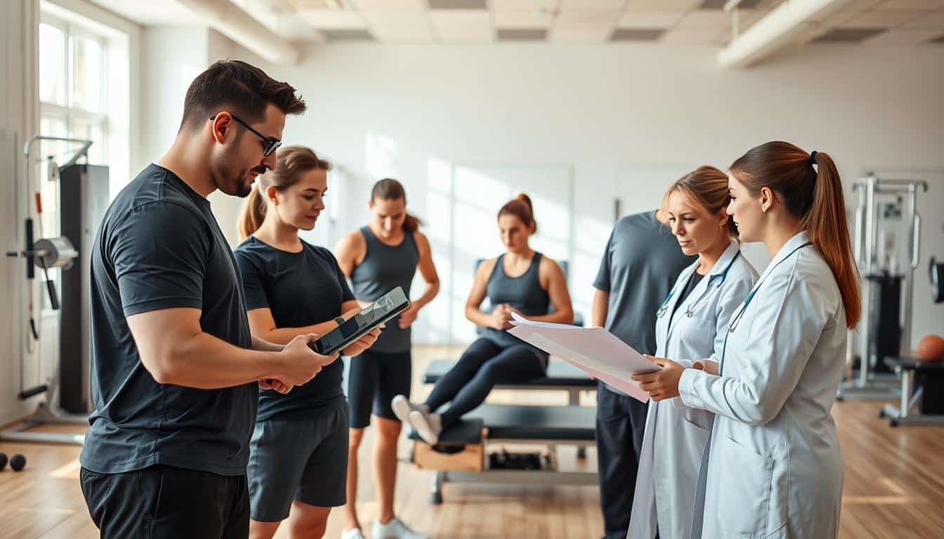 A dynamic sports therapy team collaborating in a well-lit, airy studio setting. In the foreground, physiotherapists and athletic trainers engaged in in-depth discussions, referring to patient charts and examining equipment. In the middle ground, athletes undergoing various rehabilitation exercises under the watchful eyes of the practitioners. The background features state-of-the-art therapy equipment, with a soothing, natural color palette and an atmosphere of focused professionalism. Subtle visual cues suggest open communication, shared knowledge, and a multidisciplinary approach to patient care.