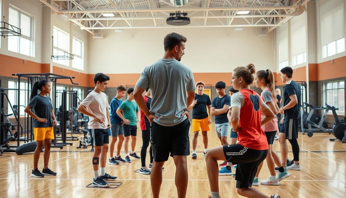A focused study session of young athletes training together in a well-equipped gymnasium. In the foreground, a diverse group of teenagers diligently practicing various exercises and drills under the close supervision of an experienced coach. The middle ground features state-of-the-art training equipment, including weight racks, agility ladders, and cardio machines. The background showcases the gymnasium's expansive, well-lit interior with high ceilings and large windows, creating a motivating and professional atmosphere. The scene conveys a sense of dedication, teamwork, and the pursuit of athletic excellence, perfectly capturing the essence of "Understanding the Importance of Research for Athletic Development".