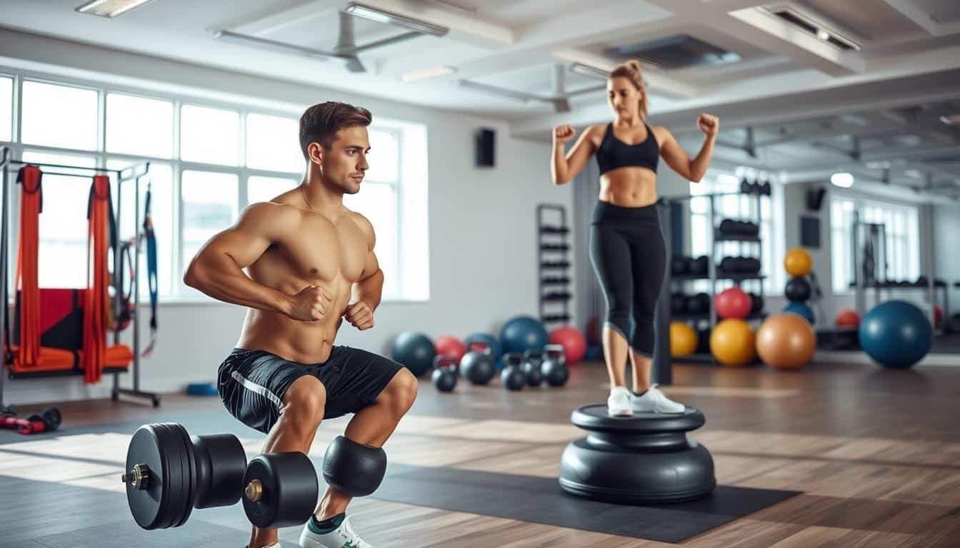 A well-lit fitness studio with a bright, airy atmosphere. In the foreground, a person performs a weighted squat, showcasing muscular strength and stability. In the middle ground, another individual balances on a BOSU ball, working on core engagement and balance. The background features exercise equipment like resistance bands, kettlebells, and stability balls, creating a comprehensive scene of diverse strength and stability exercises. Soft, directional lighting accentuates the toned physiques and engaged expressions of the subjects, conveying a sense of determination and discipline.