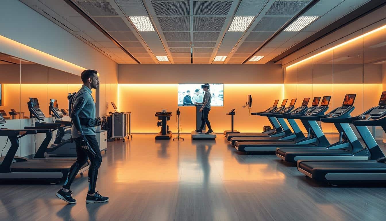 A sleek, modern rehabilitation center filled with cutting-edge technologies. In the foreground, a patient undergoes advanced exoskeleton-assisted gait training, their movements seamlessly guided by intricate robotic limbs. In the middle ground, a virtual reality station immerses another patient in a dynamic, immersive therapy session, their body movements precisely tracked and analyzed. The background showcases a range of state-of-the-art rehabilitation devices, from sophisticated treadmills to computerized balance platforms, all bathed in warm, diffused lighting that creates a calming, futuristic atmosphere. The scene conveys a sense of innovation, empowerment, and the boundless potential of modern rehabilitation techniques.