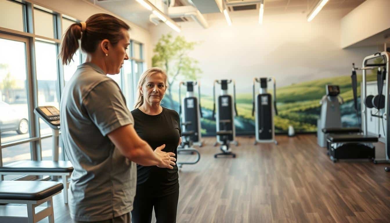 Riverside Sports Therapy Clinic, Calgary. A welcoming, modern facility with natural light streaming through large windows. In the foreground, a physical therapist guides a patient through a rehabilitation exercise, their expressions focused and engaged. In the middle ground, various therapeutic equipment and machines stand ready for use. The background depicts a serene, nature-inspired mural, conveying a sense of tranquility and healing. Soft, warm lighting illuminates the space, creating a calming, professional atmosphere. The entire scene exudes a sense of expertise, care, and a commitment to helping patients achieve their physical therapy goals.