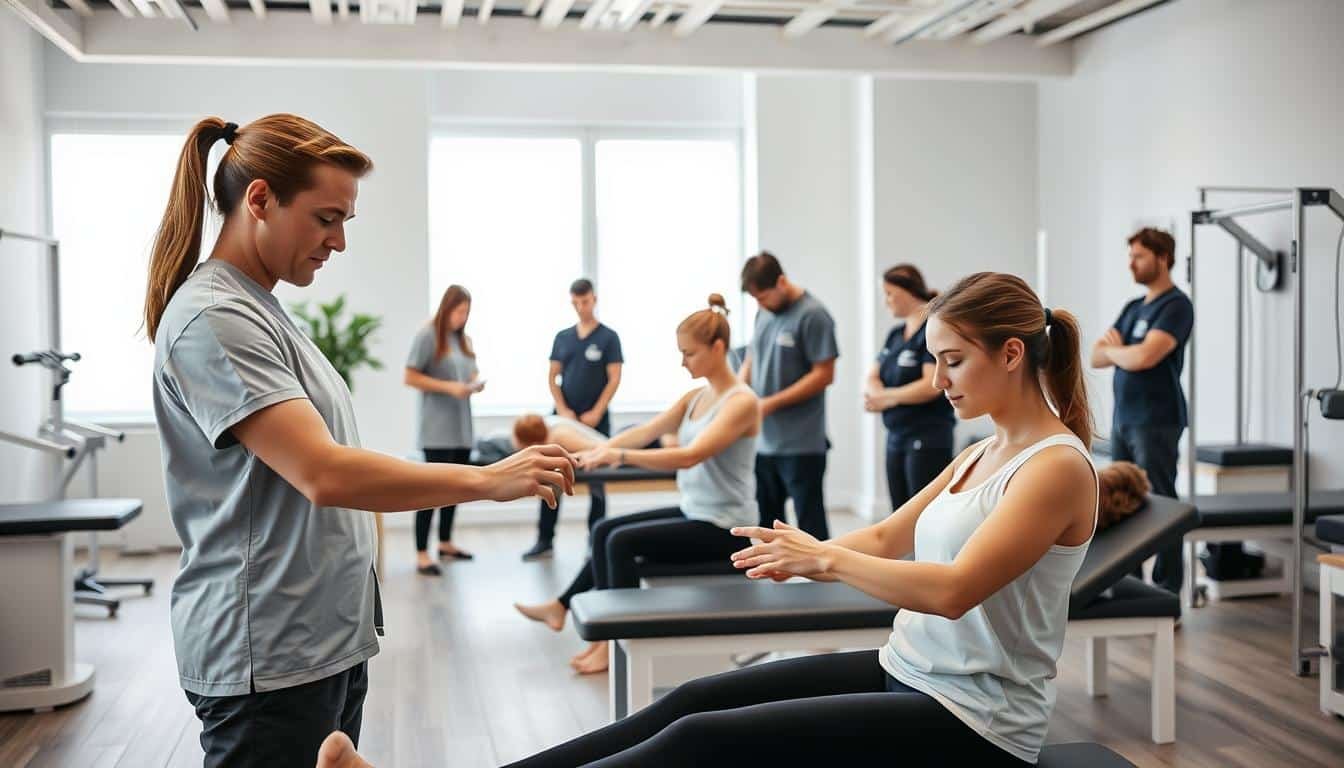 A group of healthcare professionals in a modern, well-equipped sports therapy clinic. In the foreground, a physiotherapist guides a patient through a series of targeted exercises, their expertise evident in their focused expressions. In the middle ground, other therapists attend to clients, employing a variety of techniques like massage, acupuncture, and rehabilitation equipment. The background features clean, minimalist decor with natural lighting flooding the space, creating a calming, professional atmosphere. The team's attentive posture and the clients' engaged expressions convey a collaborative, patient-centric approach to sports injury treatment and recovery.
