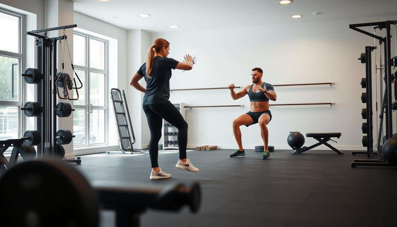 A-sports-therapy-clinic-with-a-well-equipped-gym-in-the-foreground.-In-the-middle-ground-a