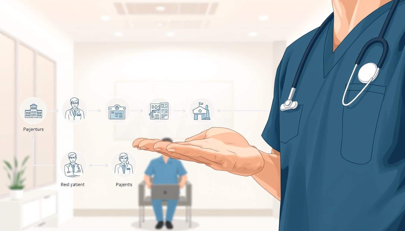 Detailed illustration of a sports therapy referral process. In the foreground, a person in a medical uniform gestures towards a series of icons representing different medical providers and facilities. The middle ground shows patients moving through the referral workflow, with arrows guiding their path. The background features a clean, minimalist medical office setting with neutral tones and soft, diffused lighting. The overall composition conveys a sense of clarity, efficiency, and professionalism in the sports therapy referral process.