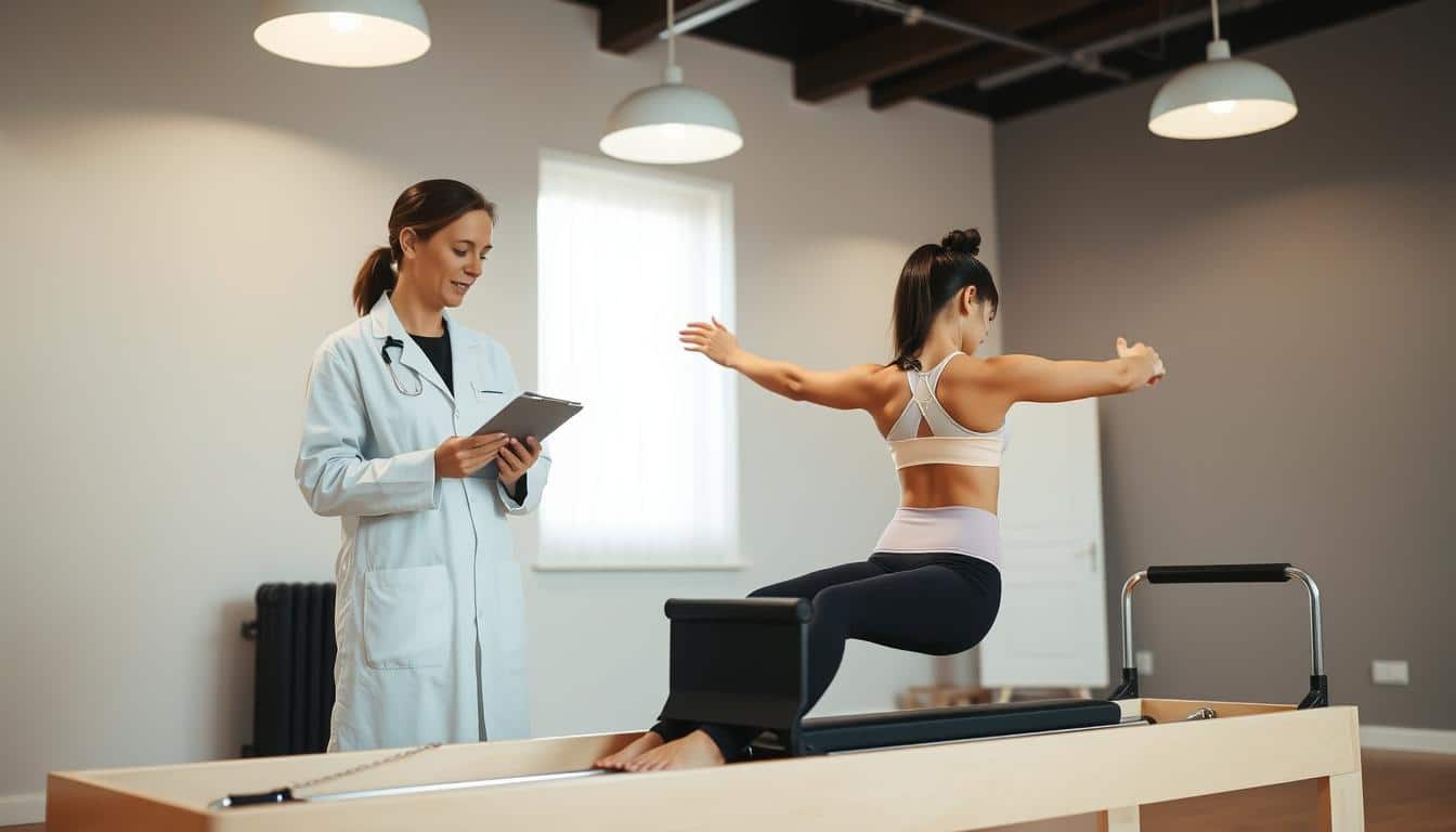 A-well-lit-clinical-assessment-room-with-a-Pilates-reformer-prominently-displayed-in-the
