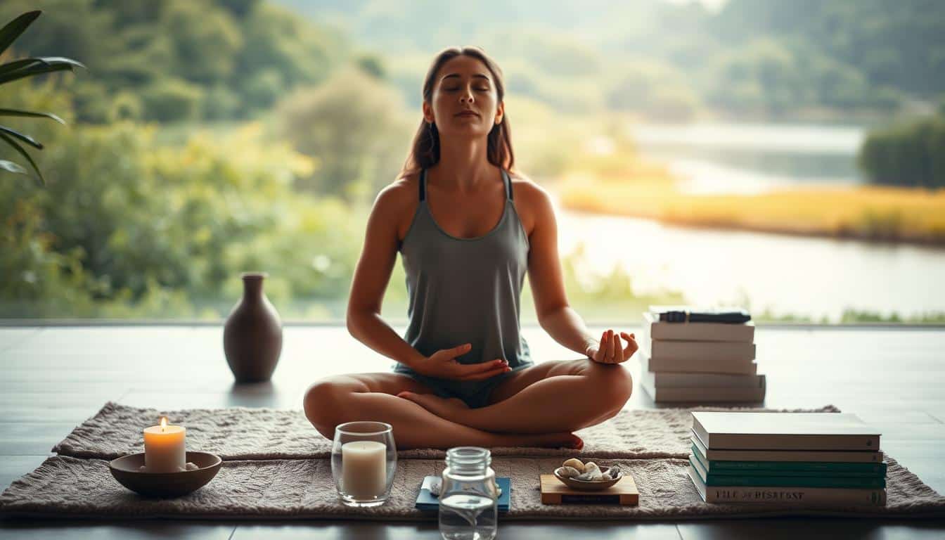 A tranquil scene of a person engaged in mind-body practices for pain relief. In the foreground, a person sits cross-legged on a plush yoga mat, eyes closed in deep meditation, hands resting gently on their lap. Soft, warm lighting casts a serene glow, creating a sense of inner calm. In the middle ground, various self-care tools are neatly arranged, including a scented candle, a bowl of crystals, and a stack of inspirational books. The background features a soothing, out-of-focus landscape with lush greenery and a calming body of water, evoking a connection to nature and the elements. The overall atmosphere is one of mindfulness, relaxation, and holistic well-being.