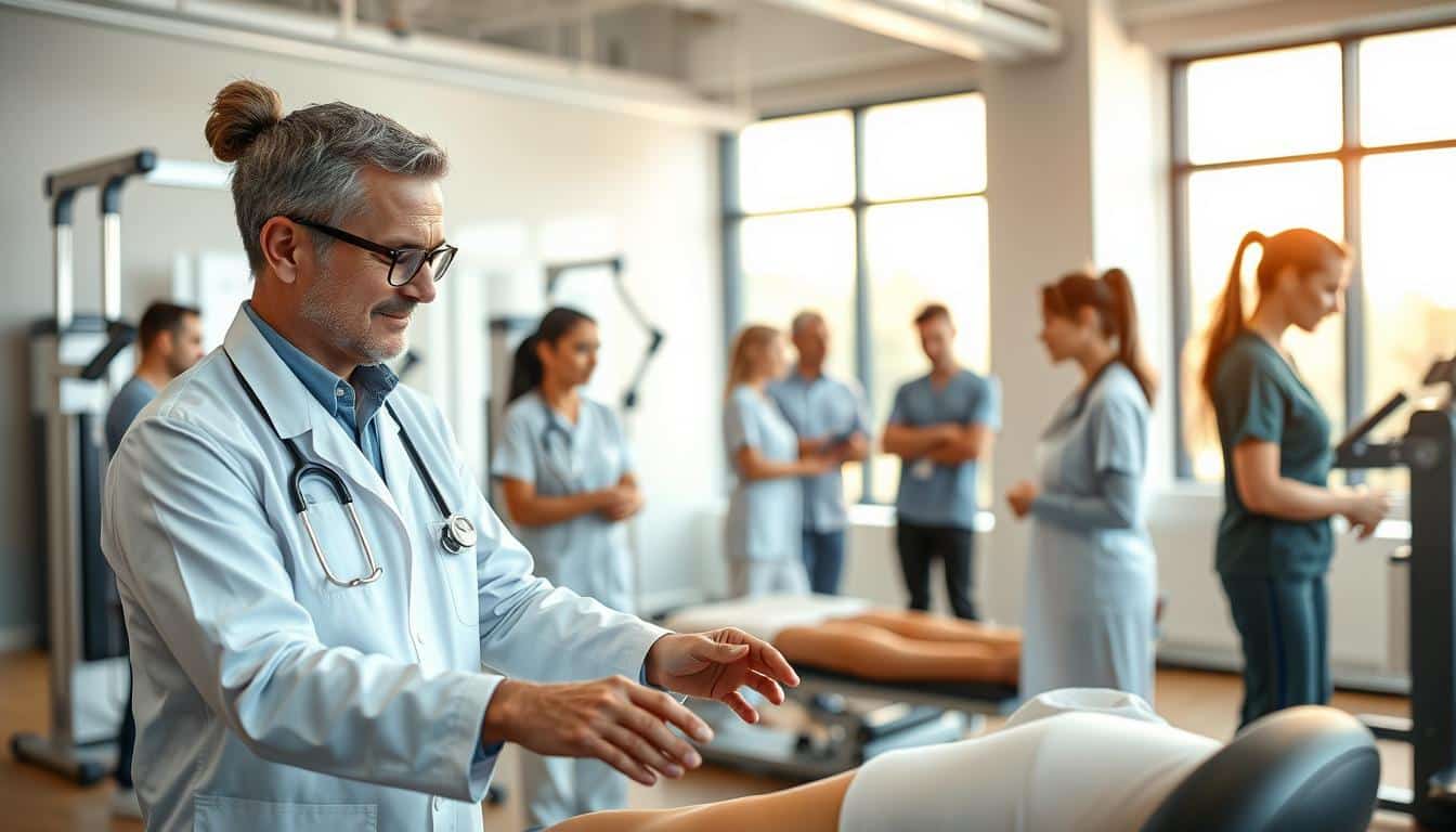 A-team-of-healthcare-professionals-in-a-modern-well-equipped-physiotherapy-clinic.-In-the