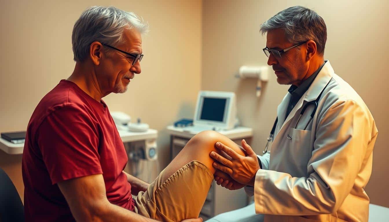 A medical examination room bathed in warm, soft lighting. In the foreground, a physician carefully examines a patient's leg, looking for subtle signs of injury or discomfort. The patient's expression conveys a mixture of concern and trust, as the doctor meticulously palpates the affected area. In the middle ground, various diagnostic tools and equipment are neatly arranged, suggesting a thorough, evidence-based approach to pain management. The background features calming, neutral-toned walls, creating a serene and professional atmosphere conducive to open communication and effective treatment planning.
