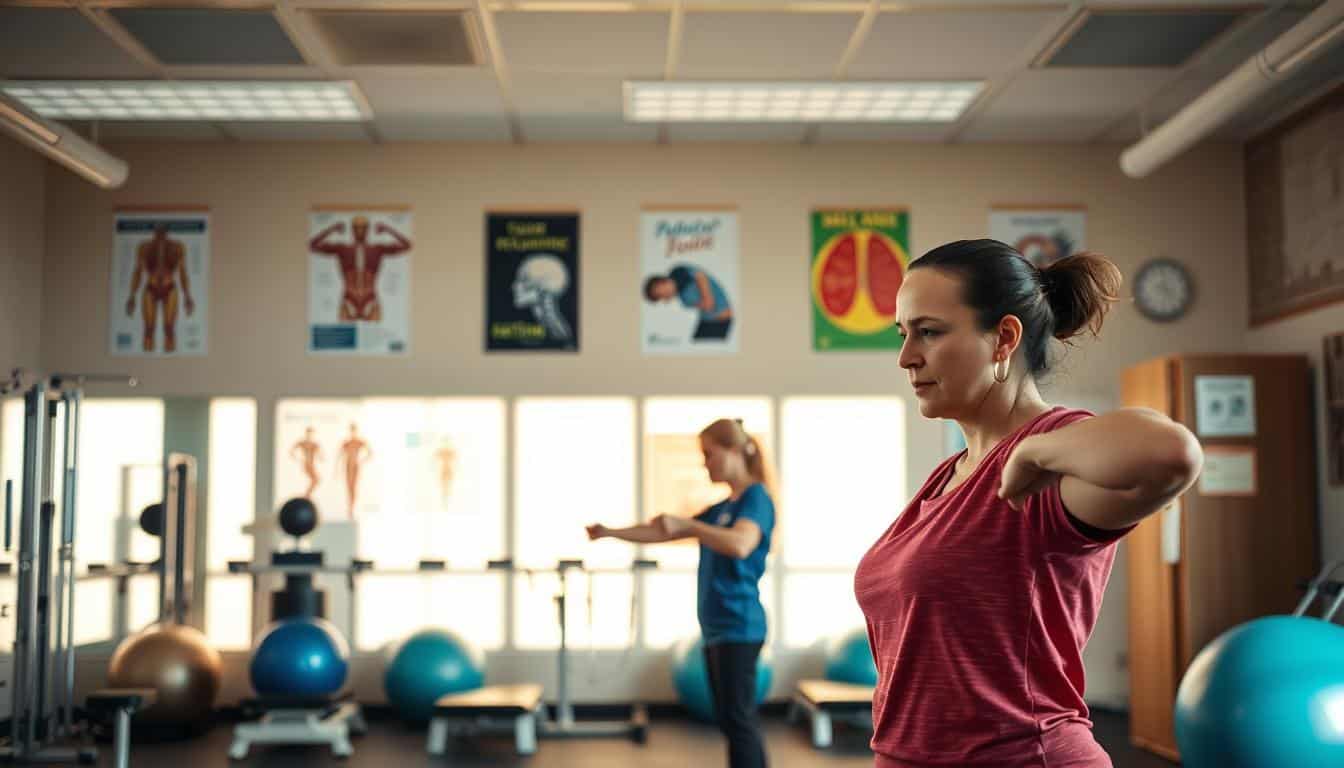 A-clinical-rehabilitation-center-bathed-in-warm-natural-lighting.-In-the-foreground-a